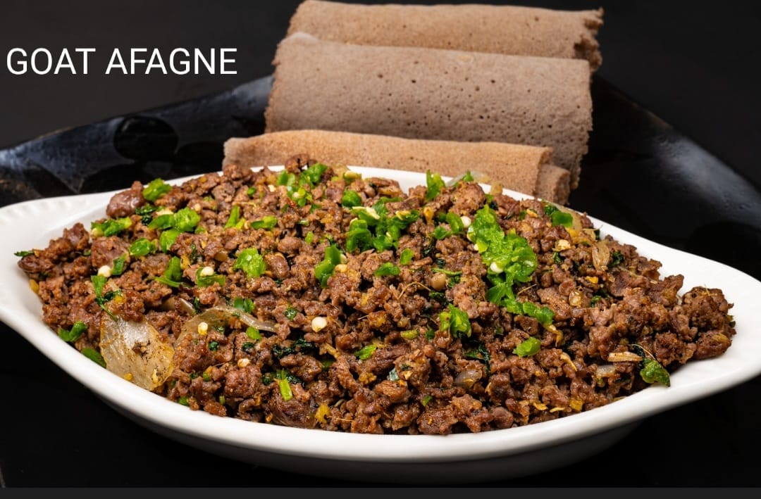 Chopped goat meat, onion, JalapeƱo, ginger, garlic; SServed with injera